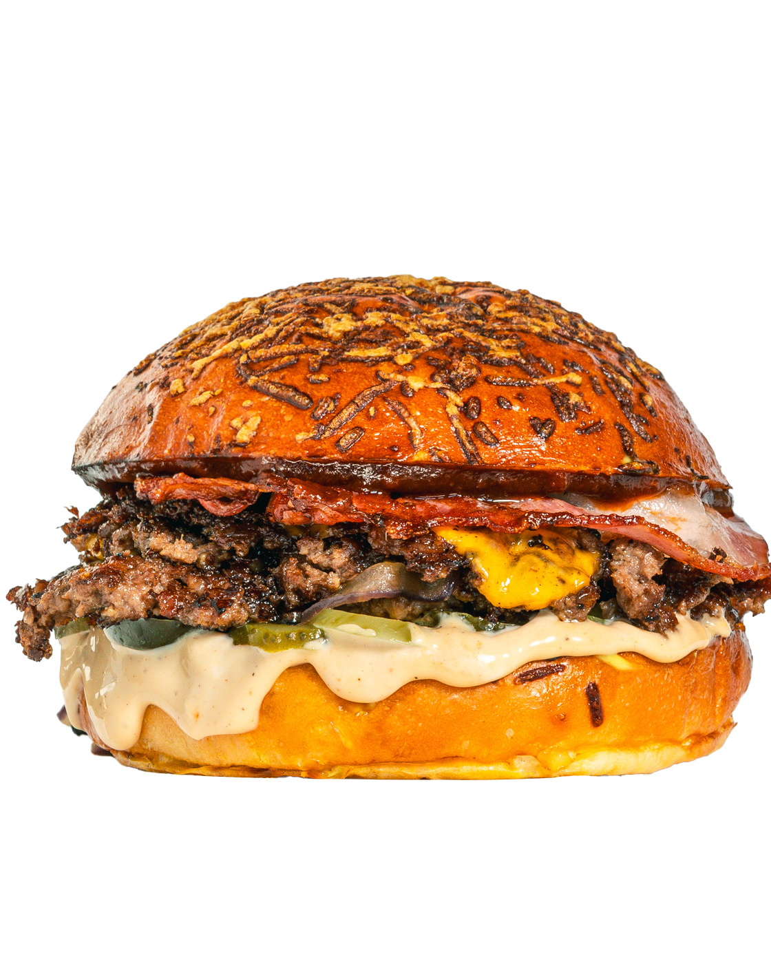 Bułeczka brioche z parmezanem / 3x Smash kotlety wołowe, smashowane razem z cebulą / 3x ser Cheddar / Bekon / pikle / sos Heisen / sos BBQ